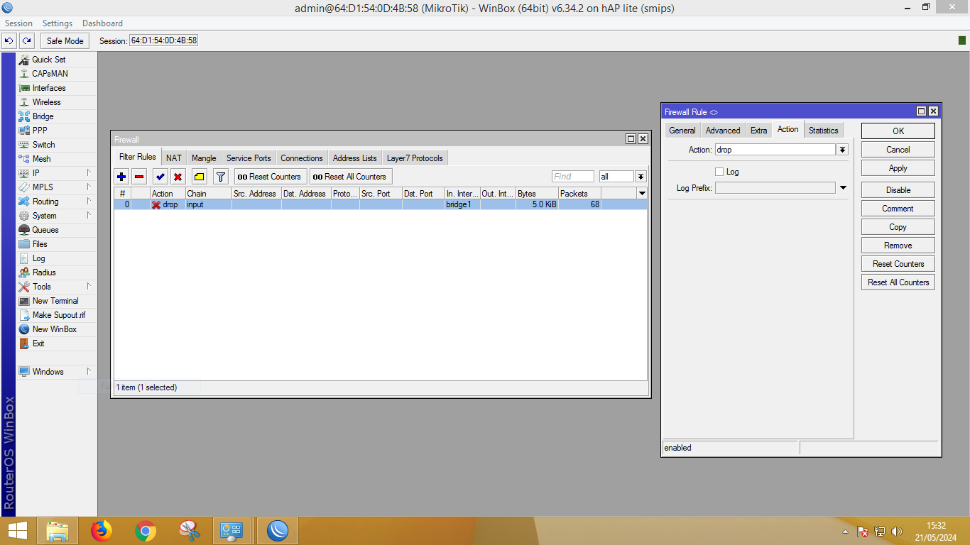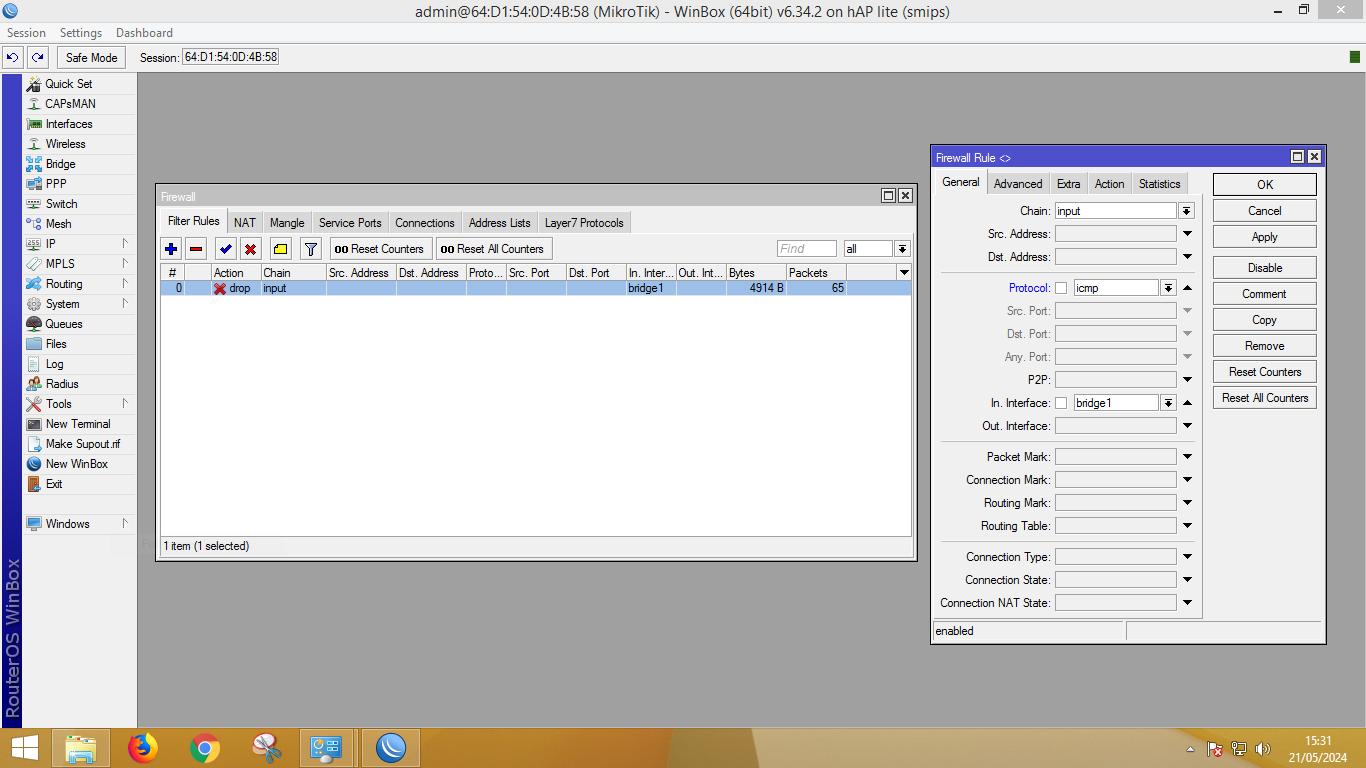13. Klik IP -> Filter Rules, Klik Add "+", Pada Tab General Chainnya Pilih "input", Protocolnya Pilih "icmp", In. Interfacenya Pilih "bridge", Klik Tab Action, Actionnya Pilih "drop", Klik Apply Lalu Ok