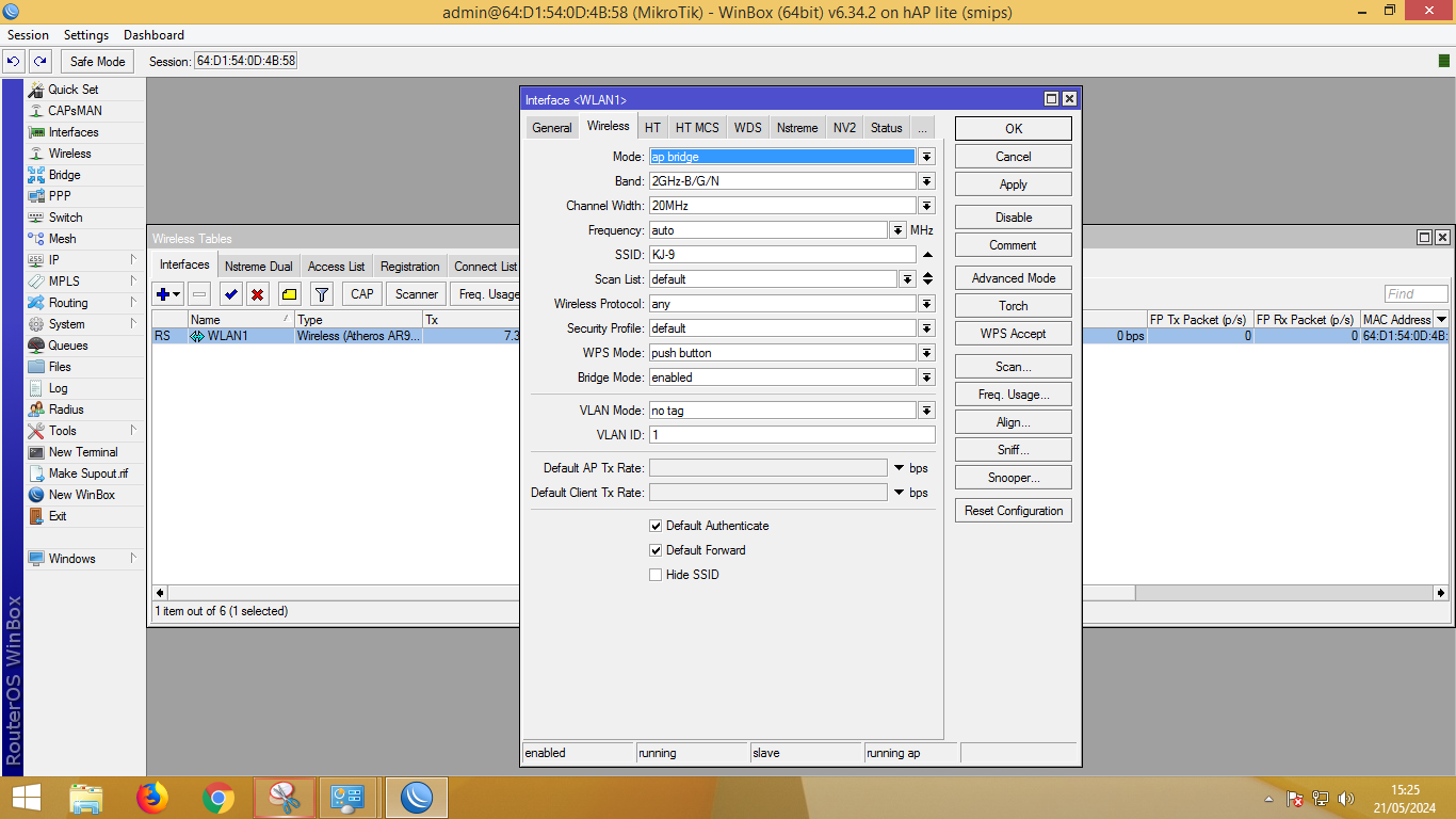 5. Klik 2x interface WLAN, Pada Tab Wireless, Modenya Pilih "ap bridge", Bandnya Pilih "2GHz-B/G/N", Frequency Pilih "auto", Kasih Nama Untuk SSID, Klik Apply Lalu Ok