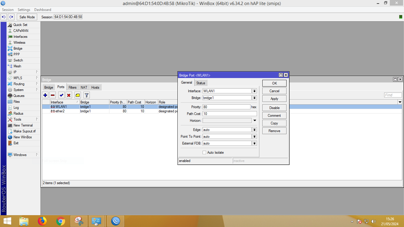 7. Klik Tab Ports Klik Add "+", Interfacenya Pilih "WLAN1" dan Bridgenya "bridge1"