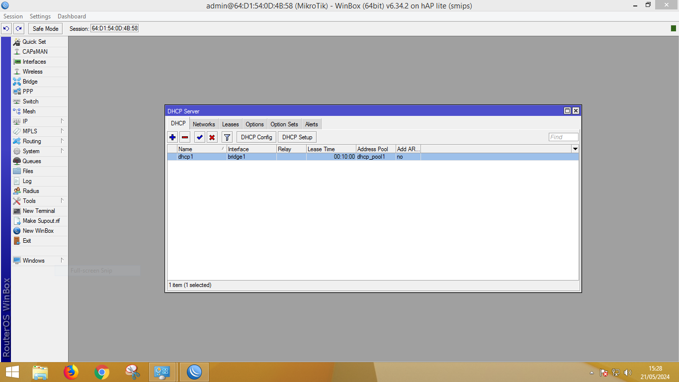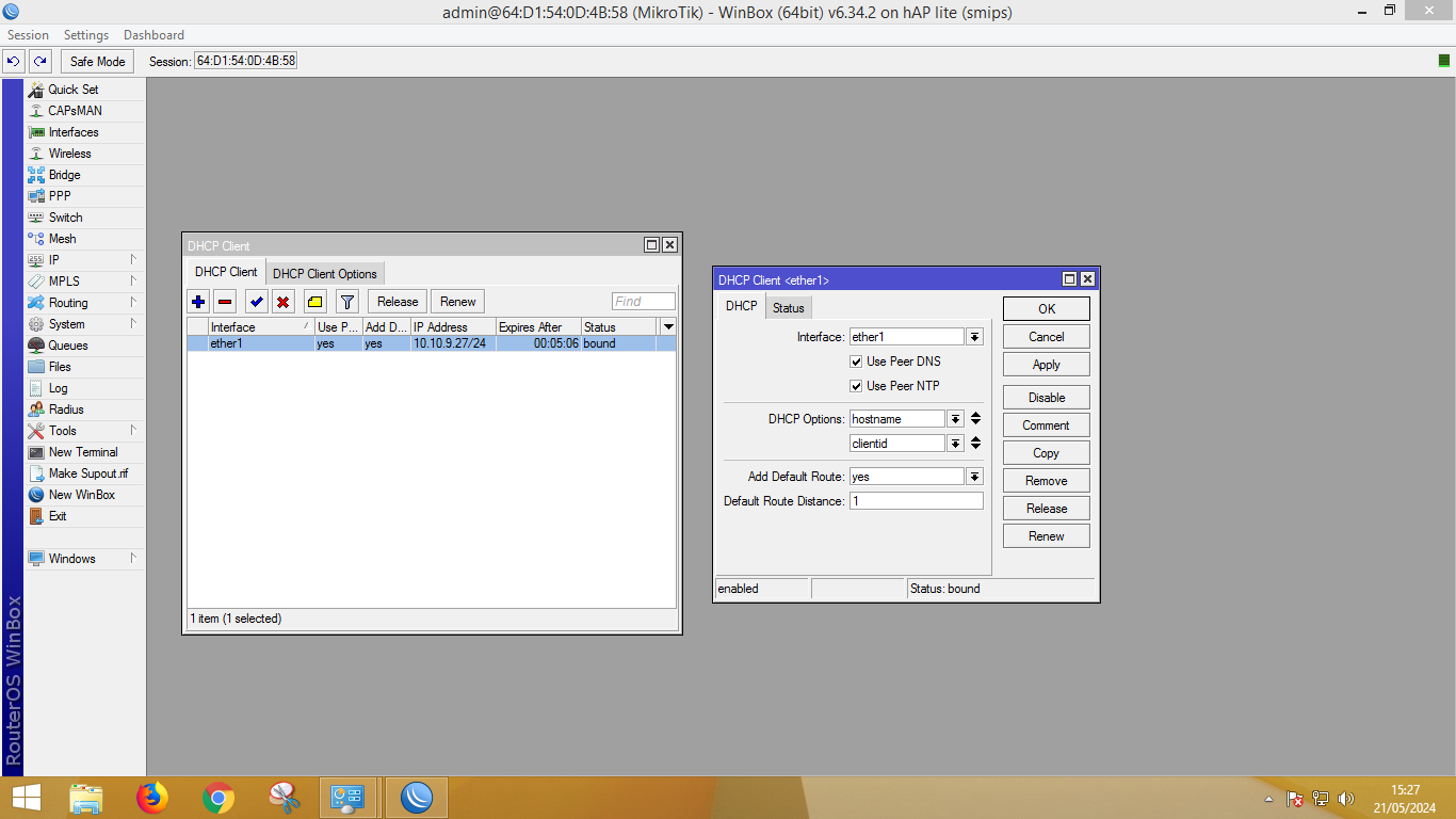 9. Klik IP -> DHCP Client, klik Add "+", Pilih Interface "ether1", Klik Apply Lalu Ok