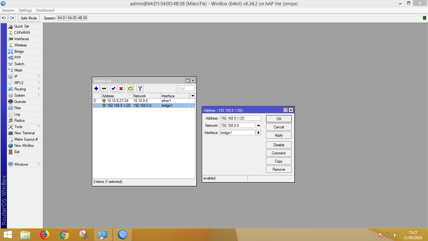10. Klik IP -> Addresses, Klik Add "+", Isi Address Dengan IP "192.168.9.1/20", Interfacenya Pilih "bridge1", Klik Apply Lalu Ok