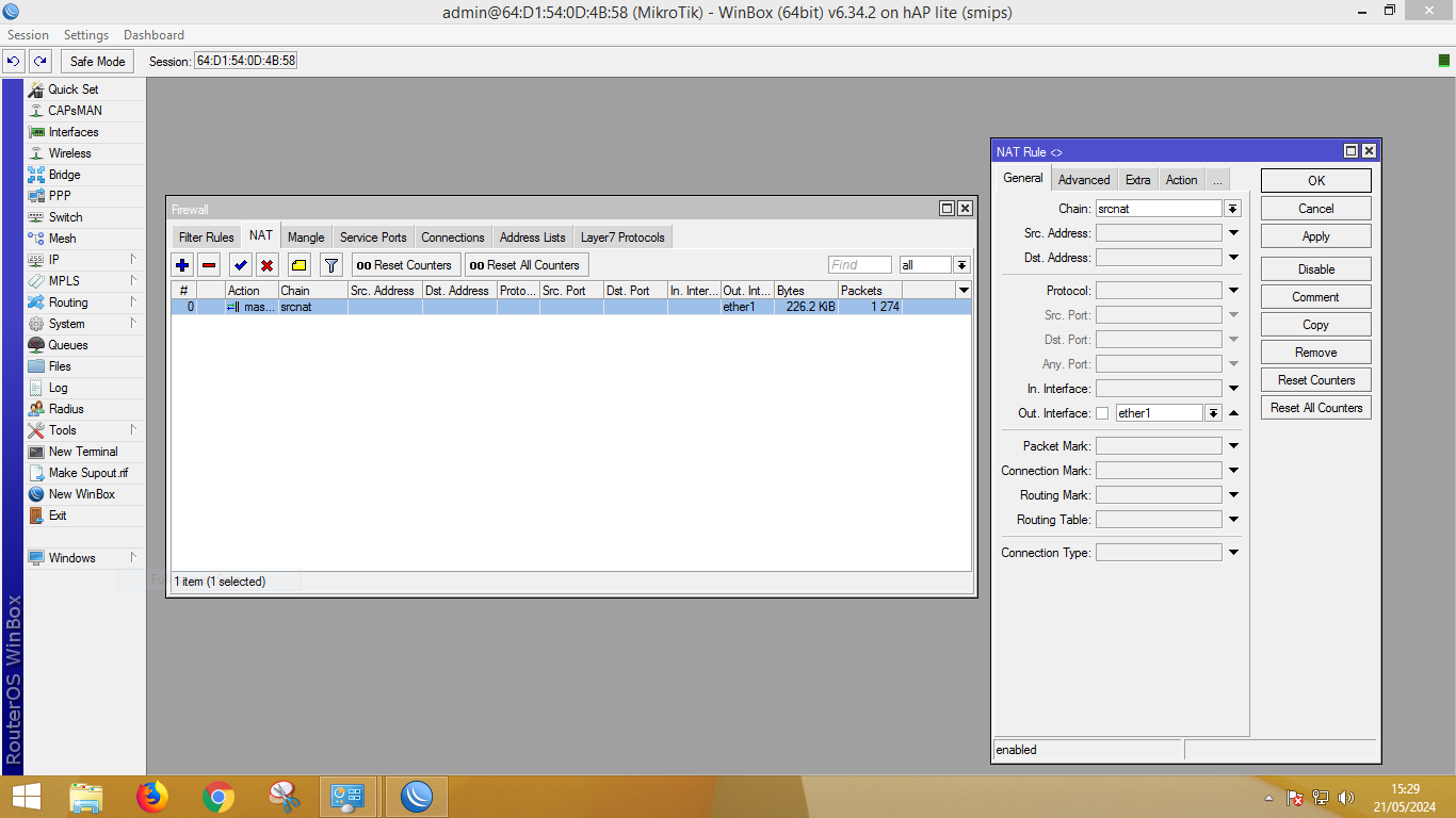 12. Klik IP -> Firewall, Klik Tab NAT Lalu Klik Add "+", Pada Tab General Chainnya Pilih "srcnat", Out. Interface Pilih "ether1", Pada Tab Action, Actionnya Pilih "masquerade", Klik Apply Lalu Ok